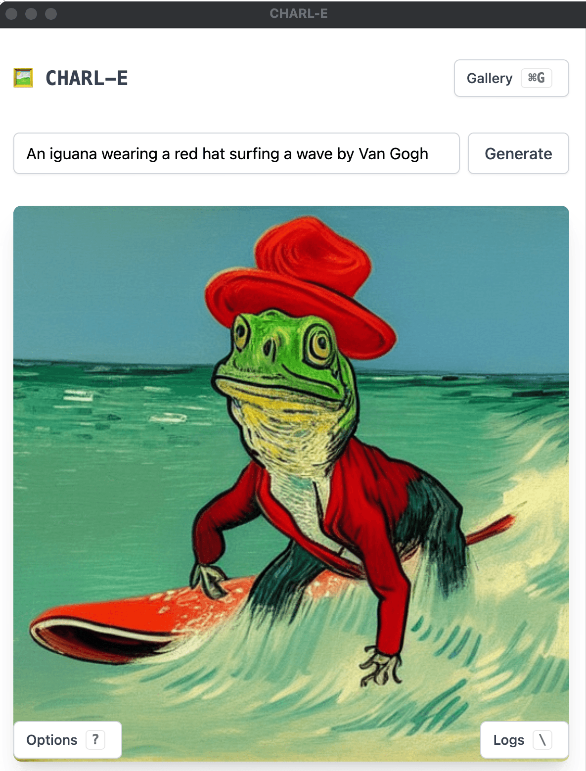 CHARL-E packages Stable Diffusion into a simple app. No complex setup, dependencies, or internet required — just download and say what you want to see.